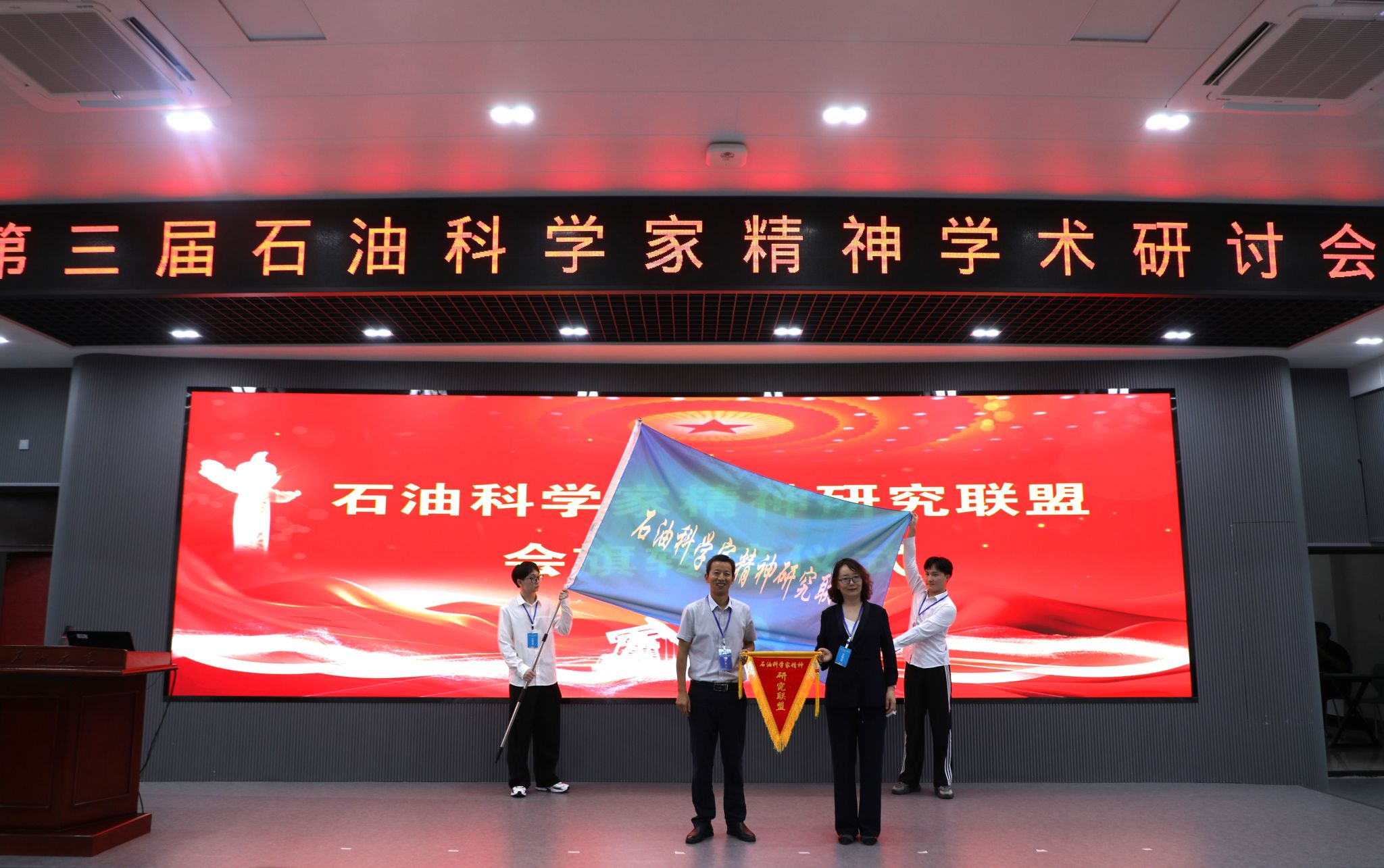在热烈的掌声中,会议完成了石油科学家精神研究联盟会旗转接仪式,第四届石油科学家精神学术研讨会将在西南石油大学举办。