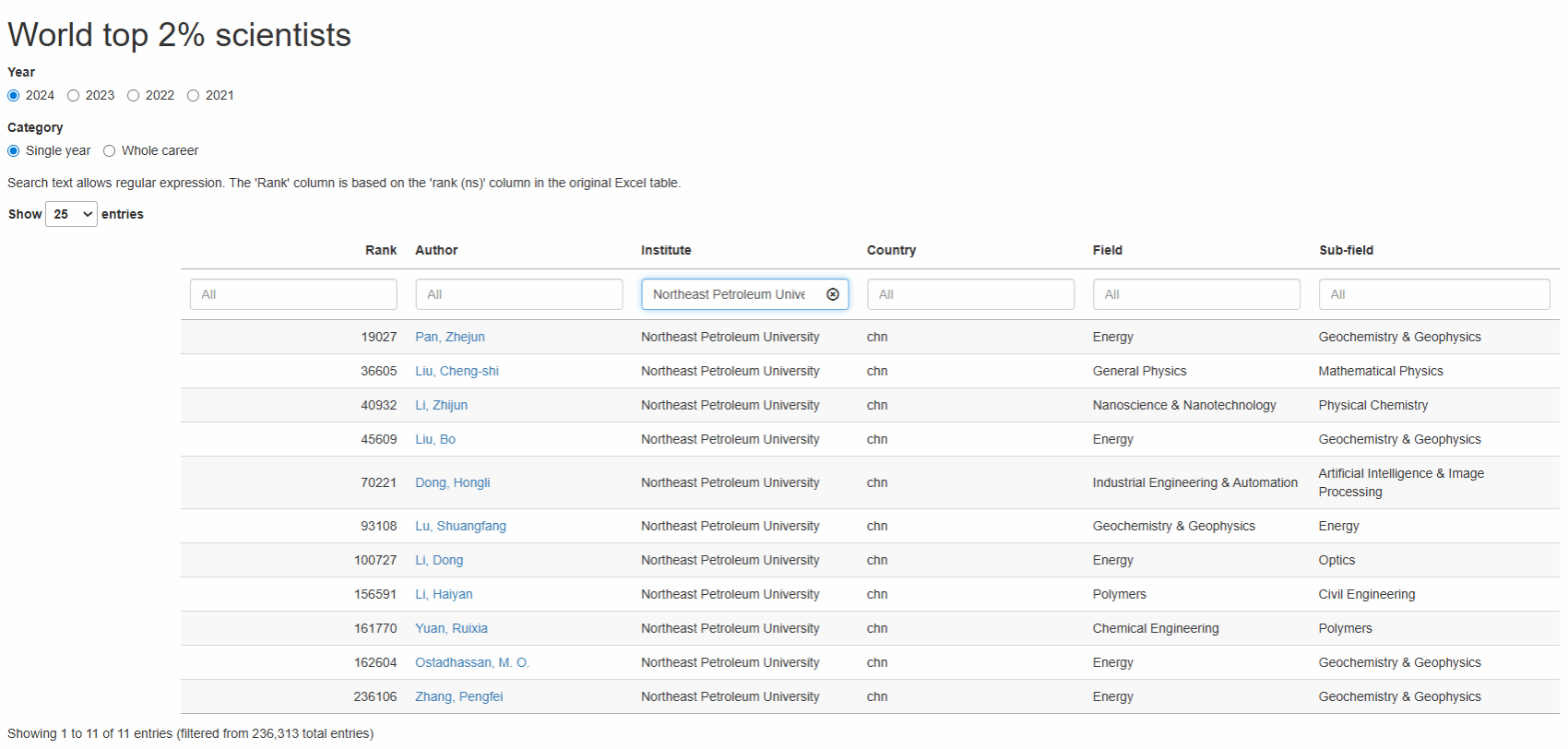 我校潘哲君、董宏丽、刘成仕、柳波、李盼池、陈作荣6位学者荣登“终身科学影响力排行榜”(表1)。潘哲君、刘成仕、李智君、柳波、董宏丽,卢双舫、李栋、李海燕、袁瑞霞、Ostadhassan, M. O.、张鹏飞11位学者荣登“2025年度科学影响力排行榜”(表2)。