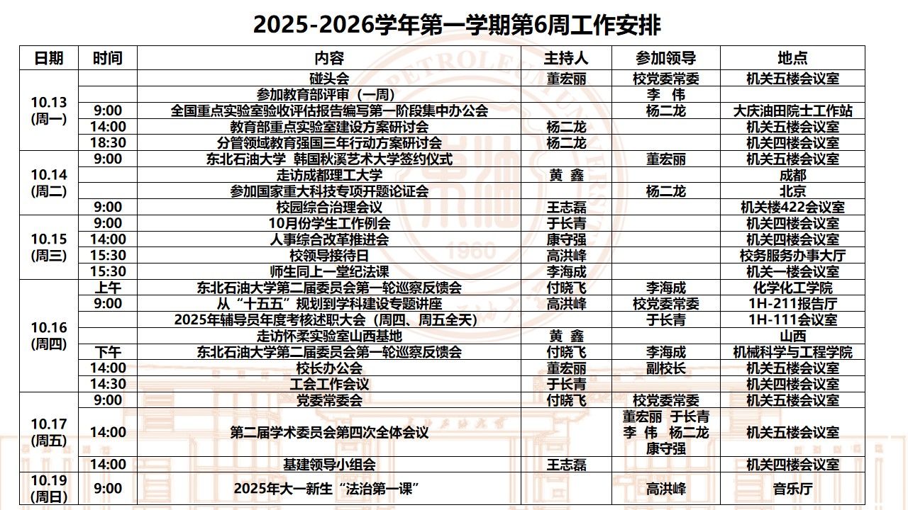 2025-2026学年第一学期第6周工作安排